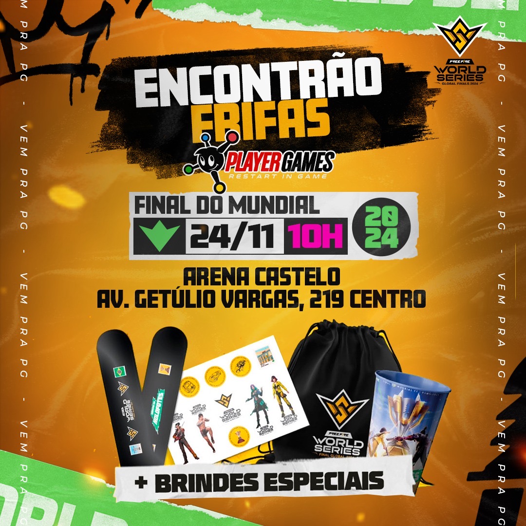 A Player Games anuncia o primeiro “Encontrão Frifas”, um evento especial para reunir os fãs de Free Fire em um momento de torcida e celebração durante a Grande Final do FFWS 2024 (Free Fire World Series). O evento acontecerá no próximo domingo, 24 de novembro, na sede da Player Games, localizada na Avenida Getúlio Vargas, 219, no Centro de Manaus. A programação começará às 10h com a transmissão oficial da Grande Final do FFWS 2024 diretamente pelo canal oficial da competição no YouTube (https://www.youtube.com/@ffesportsbr). A previsão é de que a disputa termine por volta das 15h. Além de assistir à final ao lado de outros apaixonados pelo game, os participantes terão a chance de concorrer a sorteios e brindes exclusivos, como cartelas de adesivos, copos personalizados, batecos, sacochilas e os famosos “codiguins”, que garantem itens especiais no jogo. Outro destaque do evento será o Showmatch 4×4, uma partida de exibição entre oito times que promete agitar a galera presente. A entrada é gratuita, mas o espaço está sujeito à lotação, por isso, recomenda-se chegar cedo para garantir o lugar. Para mais informações, acompanhe as redes sociais da Player Games.