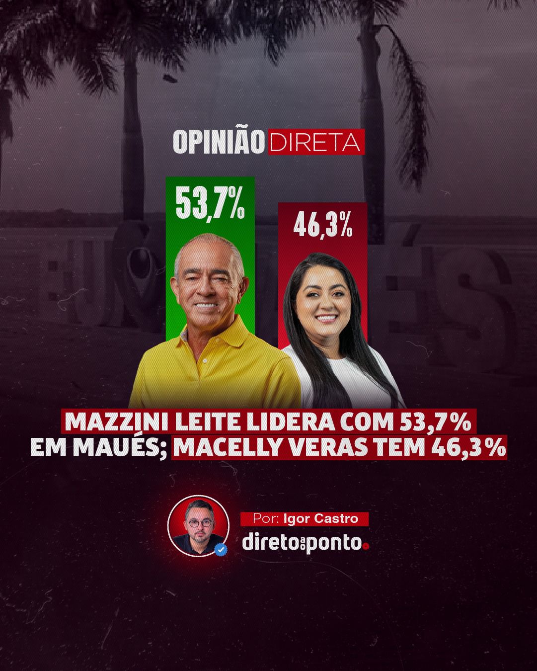 Mazzini Leite lidera com 53,7% em Maués; Macelly Veras tem 46,3%